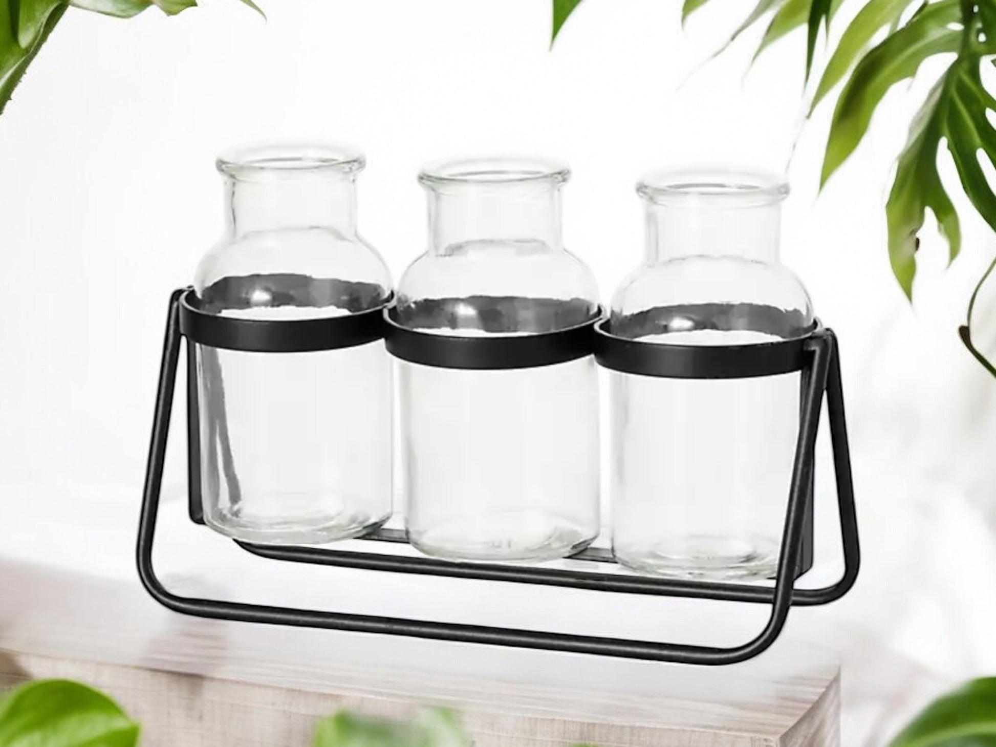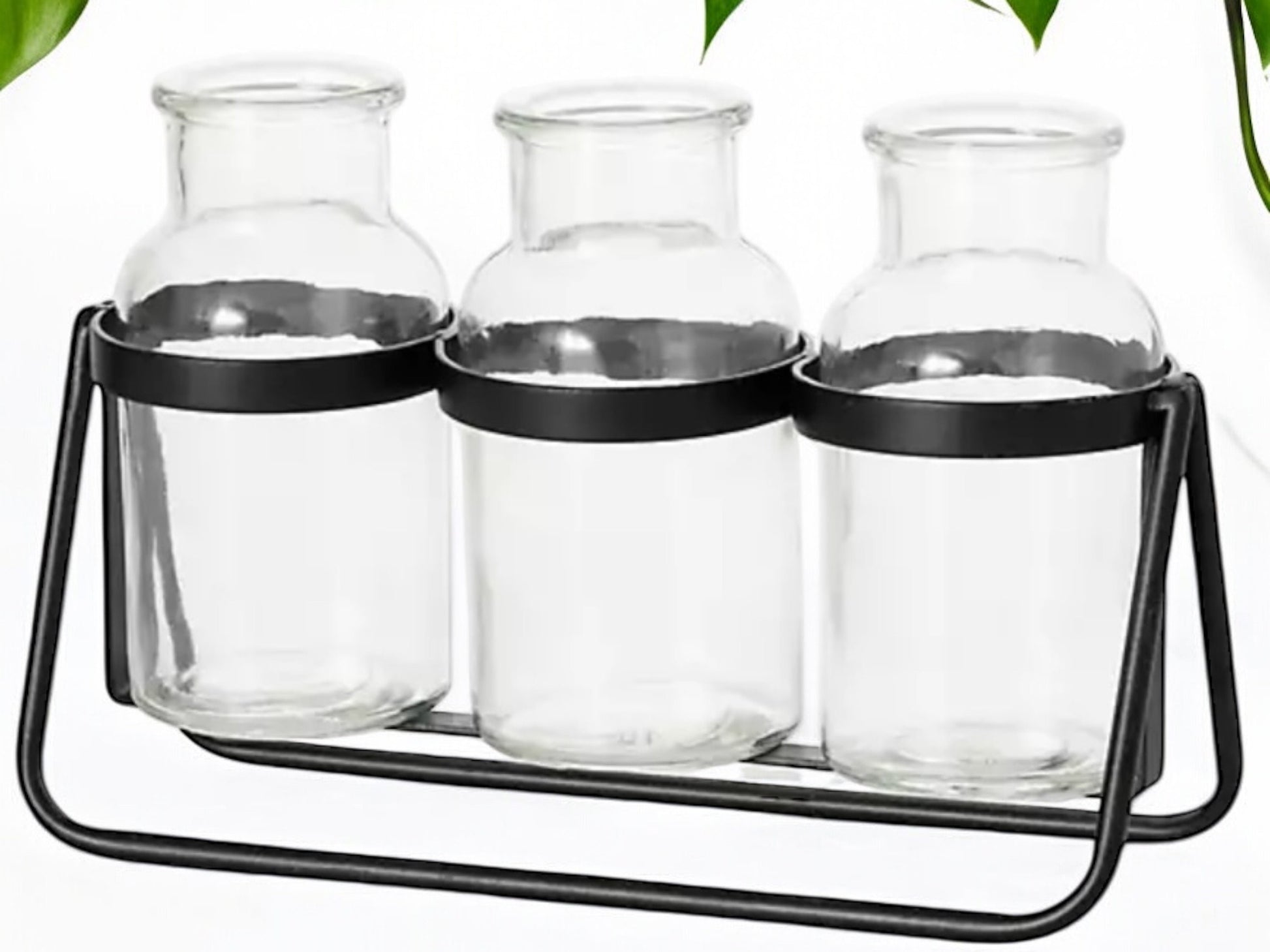 Modern Propagation Station with Black Metal Frame and Glass Bottles Vase Trio Propagate Modern Industrial Style